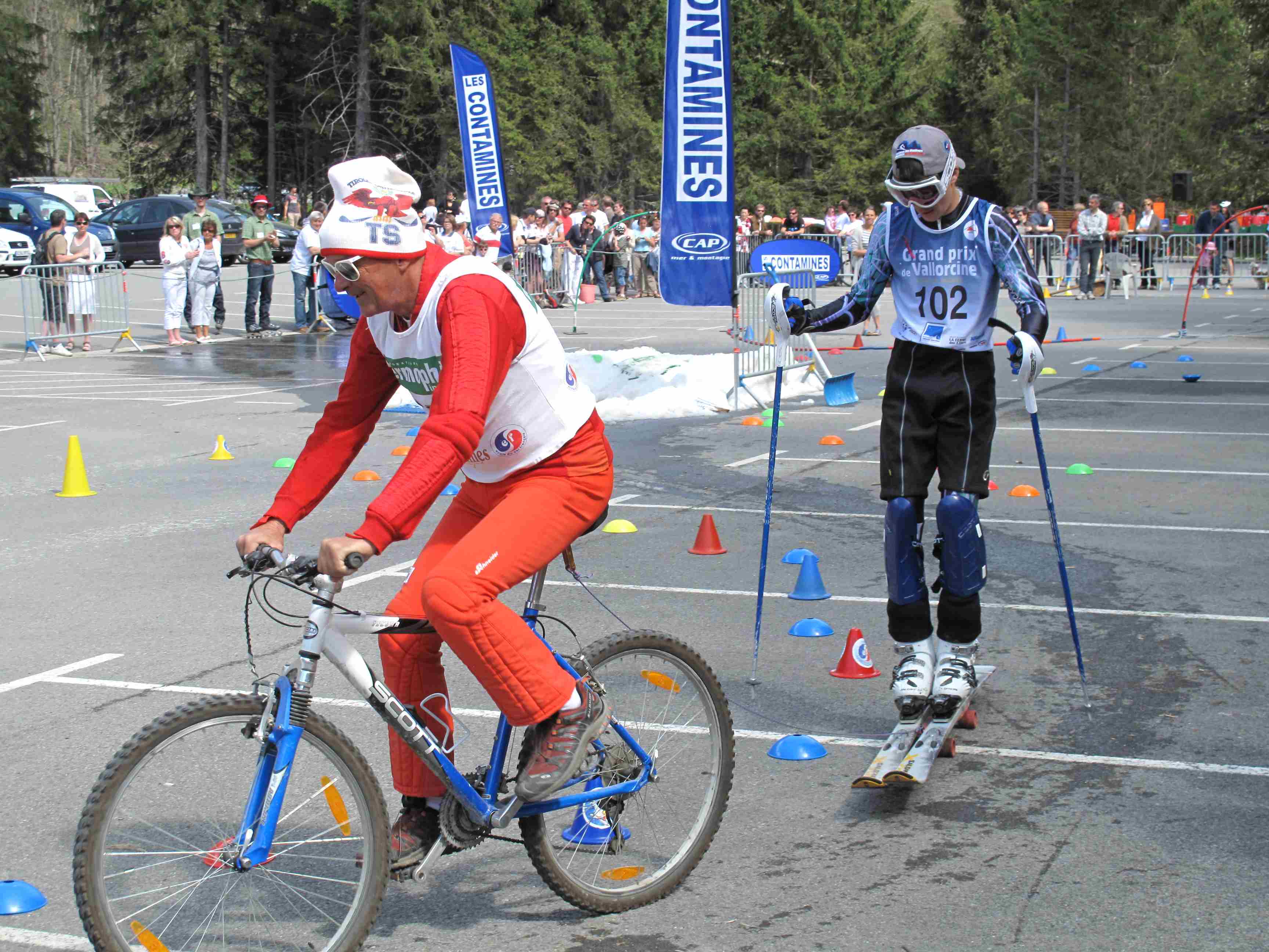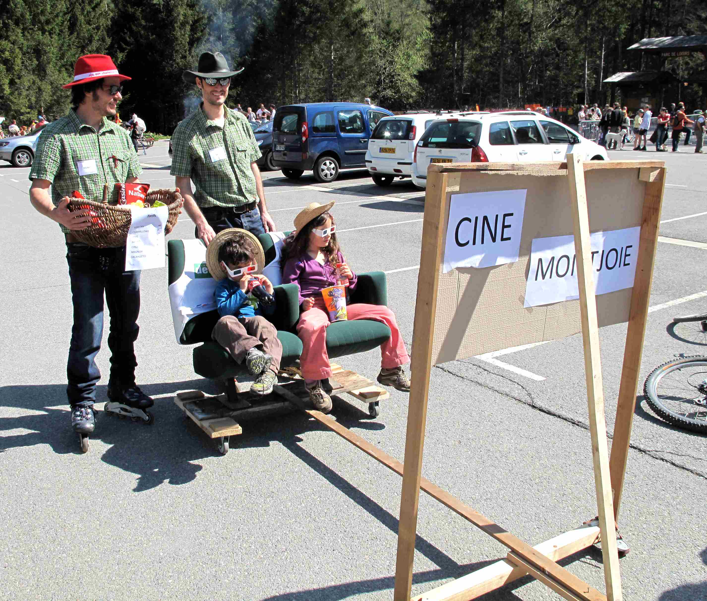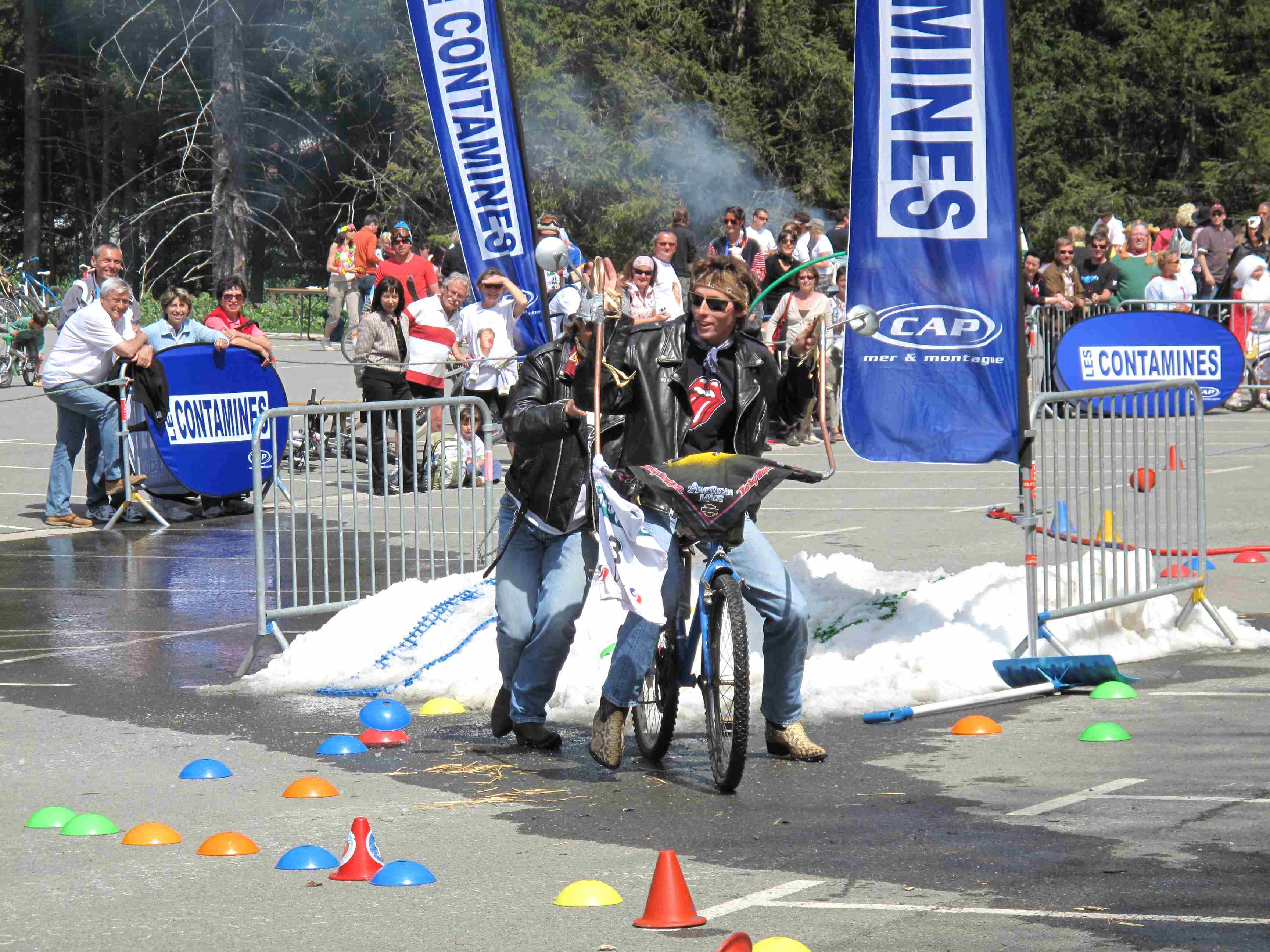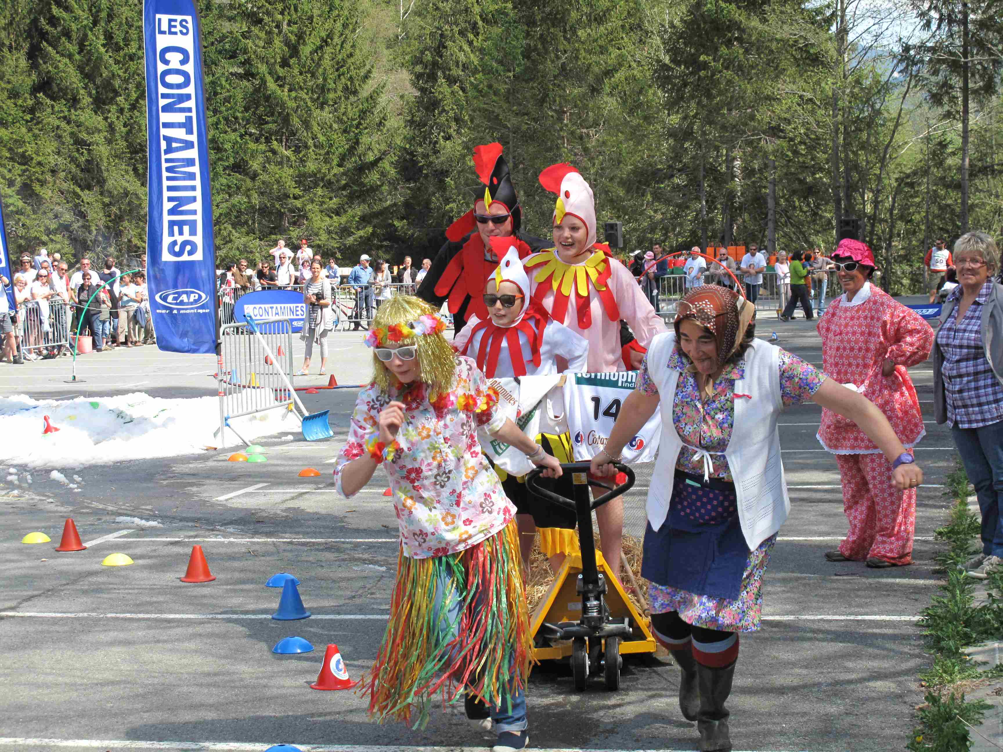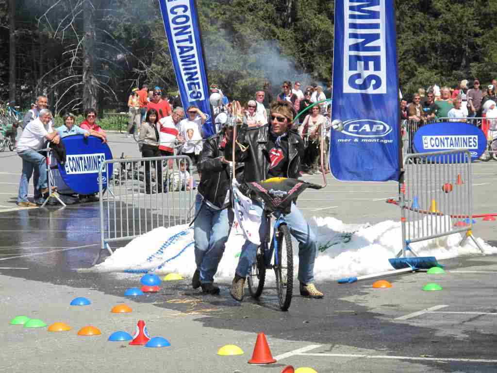 Et aujourd’hui, pour clôturer cette semaine riche en fiestas, c’était la « Bill race » aux Contamines. Cette fête de fin de saison déguisée existe depuis 5 ans en la mémoire de Bill Péan. Normalement elle a lieu sur les pistes, mais cette année elle s’est déroulée sur le parking du Pontet, non pas sur des skis mais sur « tout ce qui roule! »