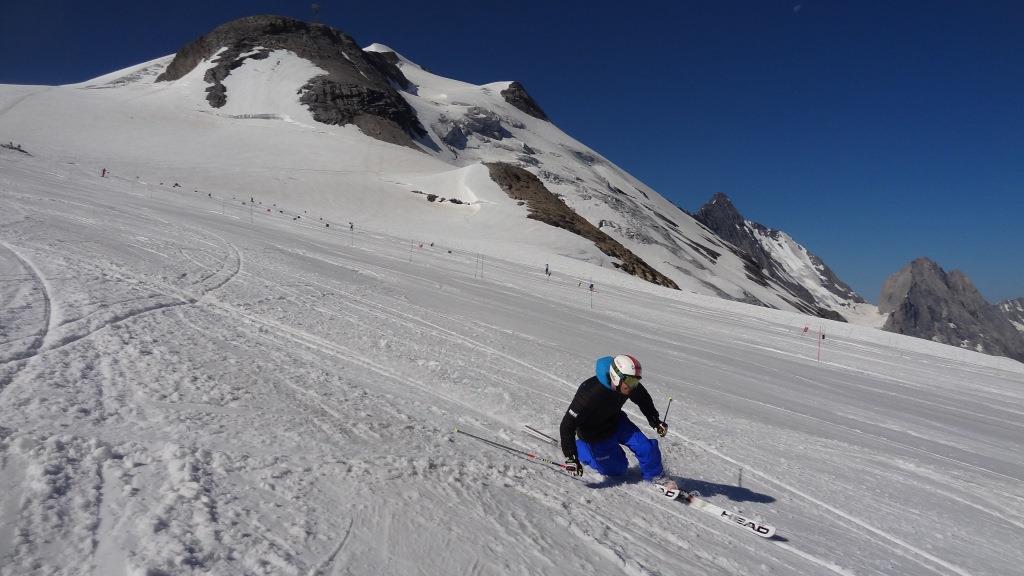 J’ai choisi les 2 jours les plus chauds de l’été pour retourner chausser les skis de télémark! C’était ce week-end avec Charlie Fradet, à Tignes. Le regel nocturne n’était donc pas optimal, je dirais même presque inexistant! Ce fut malgré tout 2 bonnes matinées de télémark, avec reprise des sensations le samedi, tout en légèreté sur cette neige molle, puis un peu plus d’engagement le dimanche, toujours en ski libre. Je voulais également en profiter pour tester des nouveaux skis Head, plus rigide, donc plus exigeant, mais aussi plus nerveux. Plutôt positif… à retester sur de la neige dure!???????????????????????????????Ca creuse des tranchées sur Rosolin!
