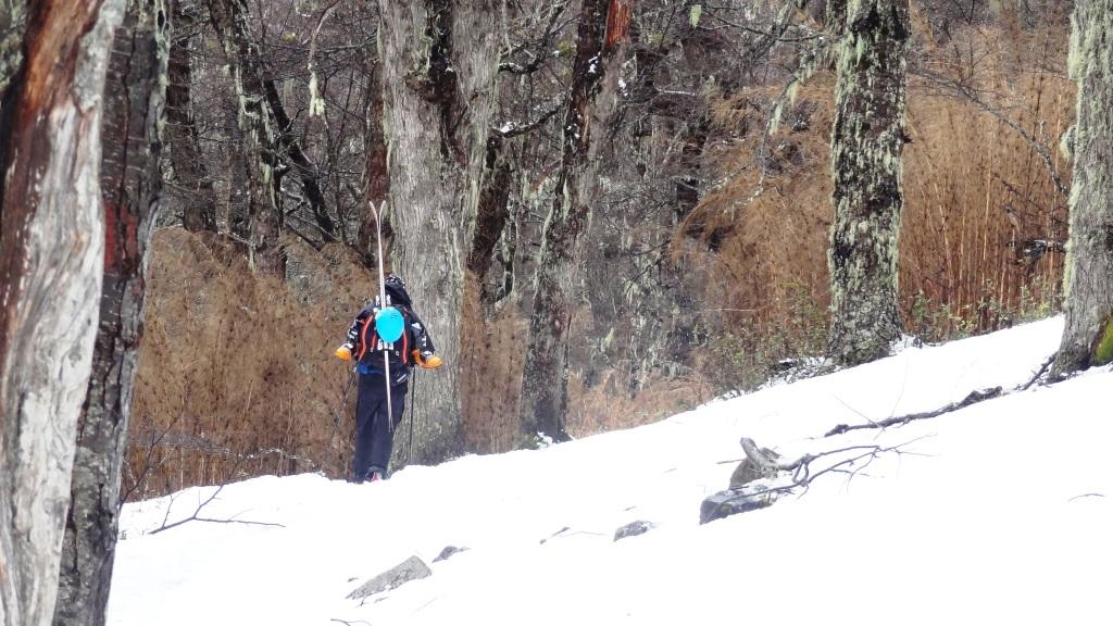Le temps reste couvert en ce vendredi matin, avec de fortes rafales de vent à se faire coucher par terre ! Petite accalmie l’après-midi, et légère éclaircie : ni une ni deux, nous voilà parti pour explorer les alentours et se dégourdir les jambes ! Direction la « Roca inclinada », sommet rocheux surplombant une pente peu soutenue, sans risques d’avalanche. Après une petite grimpette sans les skis au sommet, nous apprécions quelques virages dans la neige légère, un plaisir de courte durée avant d’arriver dans de la neige lourde et collante, un régal !