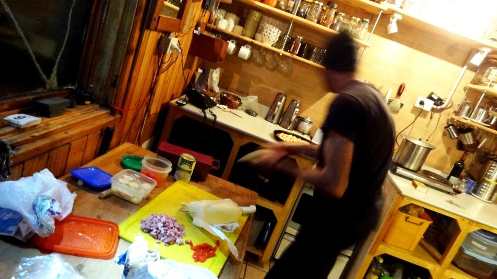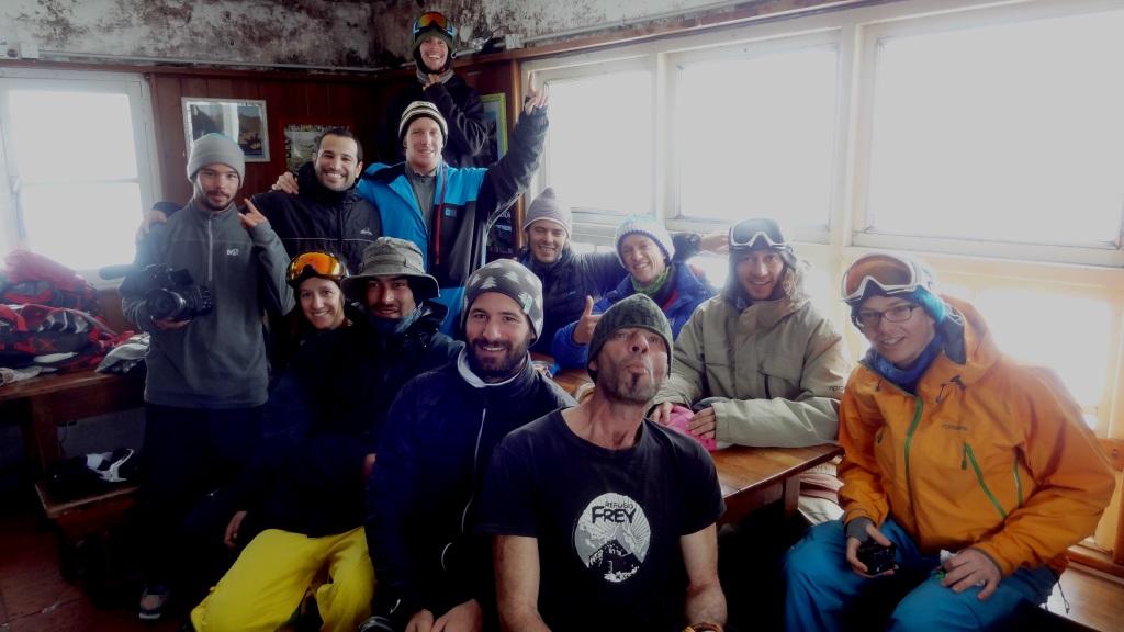J2_crew_freyNous retrouvons toute une équipe de skieurs français présents depuis quelques jours au refuge, dont PVS en tournage dans le coin… drôle ! Ils prendront le chemin du retour ce jour, nous voilà donc en petit comité pour les prochains jours.