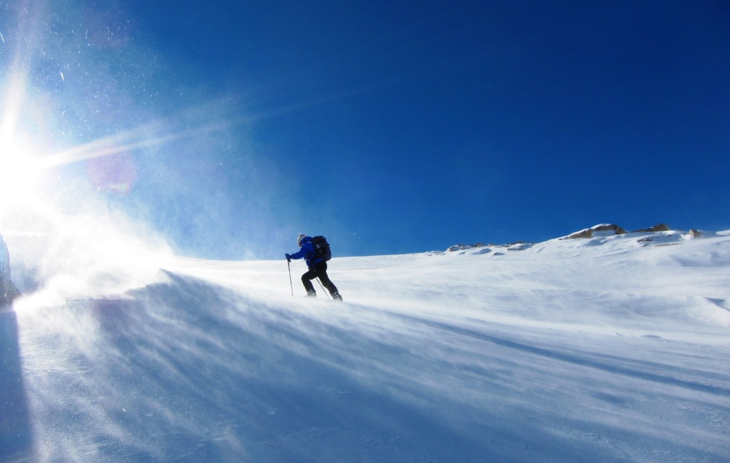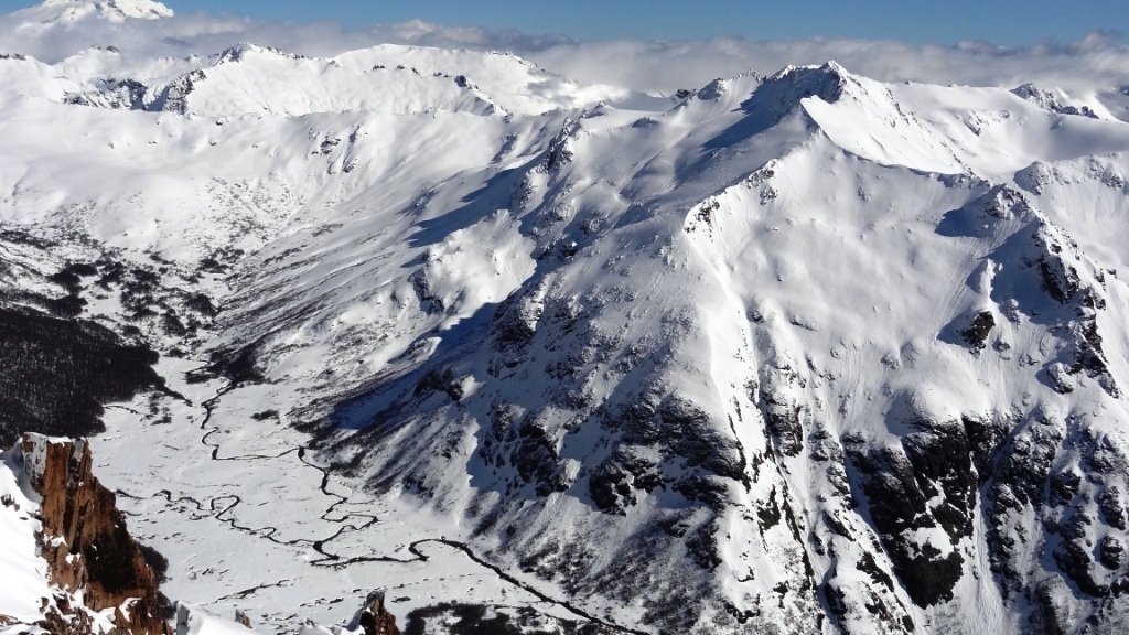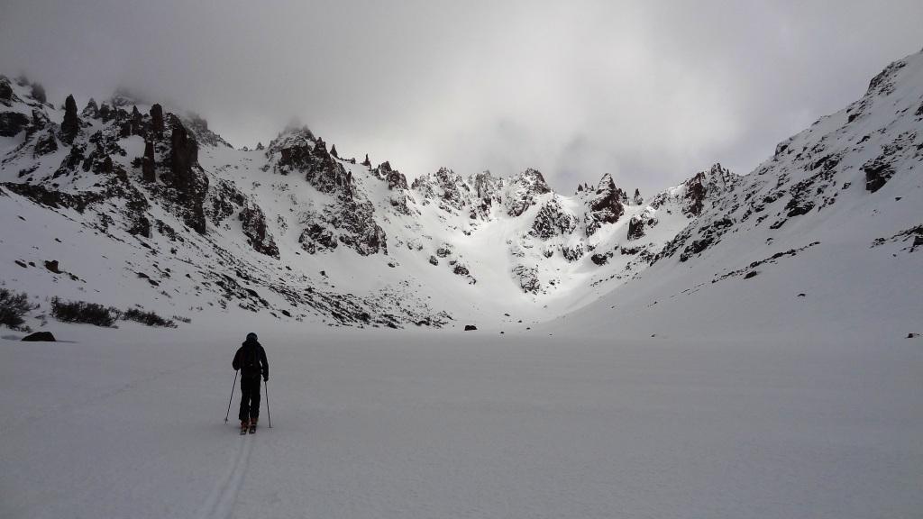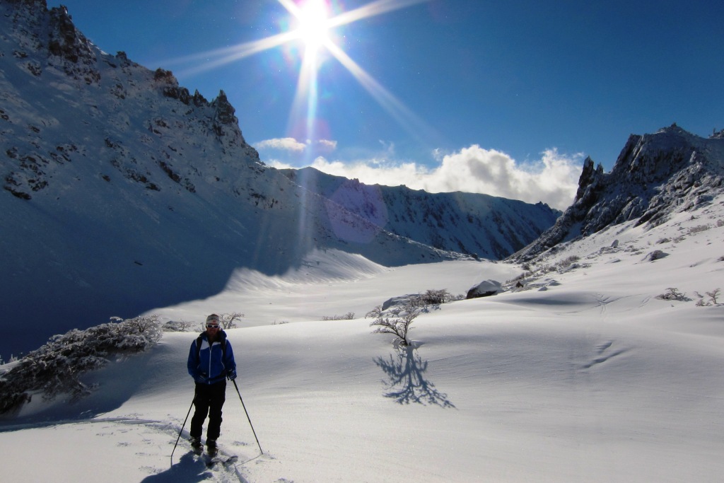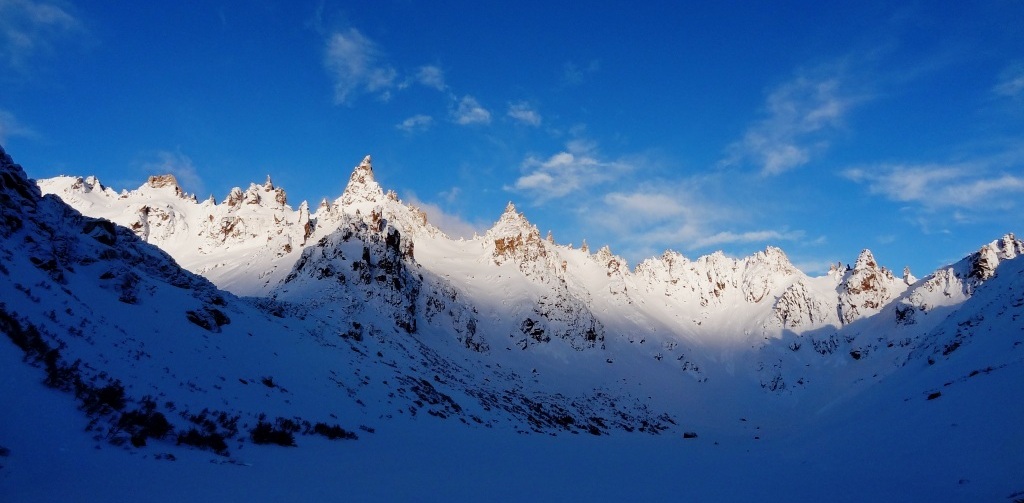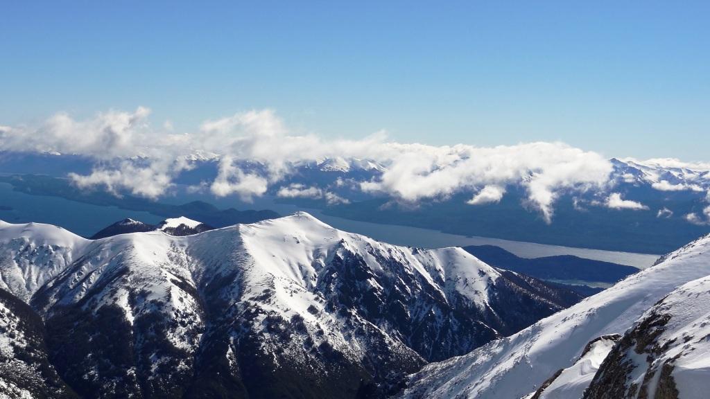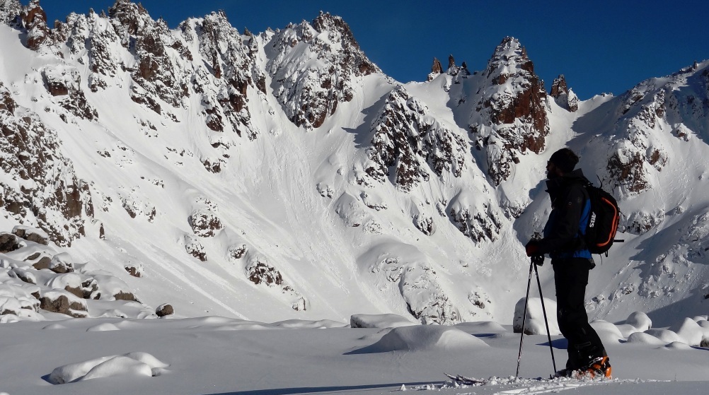 Cet adage a pris tout son sens ce samedi matin, jour prévu du départ. La veille en allant me coucher, il pleuvait à grosse goutte, et pour moi l’affaire était pliée, nous allions redescendre vers Cerro Catedral de bon matin. Mais en se levant, surprise ! Grand beau, froid, une fine couche de neige fraîche devant le refuge, pas de vent…on dirait bien que la patience va payer ! Ni une ni deux nous avalons notre petit-déj avant de prendre la direction du couloir principal vers le fond du cirque, orienté Nord-Est. Toutes ces faces qui prennent le soleil assez tôt le matin ne nous inspirent pas grande confiance, surtout avec l’humidité accumulée dans le manteau neigeux ces derniers jours. A peine quelques minutes plus tard, les différents couloirs commençaient à se purger, par de petites coulées devenant assez vite volumineuses… Bref, ce n’était même pas la peine d’essayer. Il ne nous restait alors qu’une seule option : se diriger vers les pentes orientées sud, qui ne prennent le soleil que plus tard dans la journée, et où la pente est plus faible : l’itinéraire de montée était donc relativement sur et sans risque. Vamos ! En se relayant pour faire la trace dans une neige de plus en plus légère et profonde, nous sentions que cette option allait être la bonne. Nous sommes arrivés assez vite au sommet des pentes sud, au-dessus de la « Laguna Schmoll », avec un panorama majestueux de l’autre côté de la crête, sur le lac de Bariloche ainsi que sur le volcan Cerro Tronador, plus haut sommet de la région (3500 m).