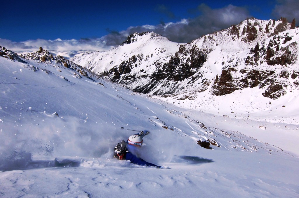 J’ai eu la chance de passer quelques jours au refuge Frey la semaine dernière, situé en Argentine, dans la région de Bariloche au Nord de la Patagonie, avec l’ami Julien Prevot, fidèle compagnon d’aventures en Amérique du Sud ! Le refuge Frey se situe dans un cirque : il est entouré à 180° de sommets et de pentes de toutes inclinaisons et orientations, d’un dénivelé compris entre 300 et 600 mètres environ. Bref, c’est LE spot parfait pour le ski freeride !