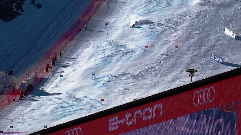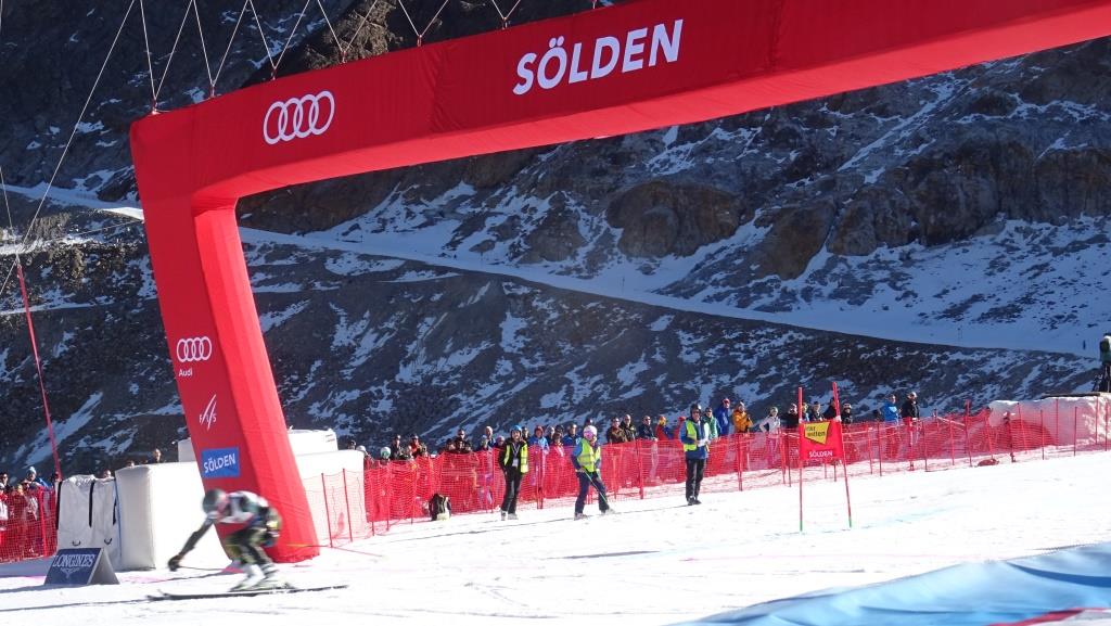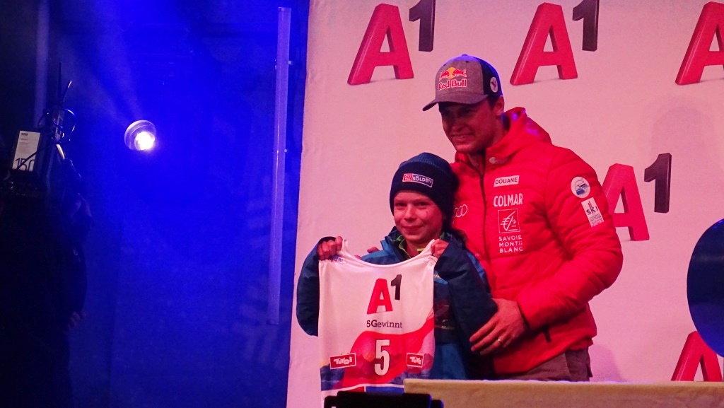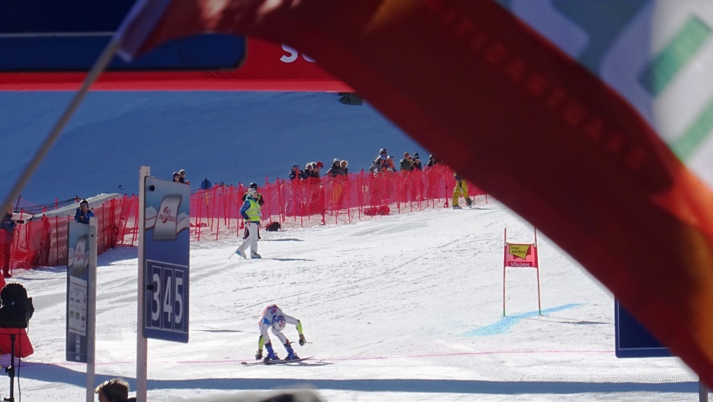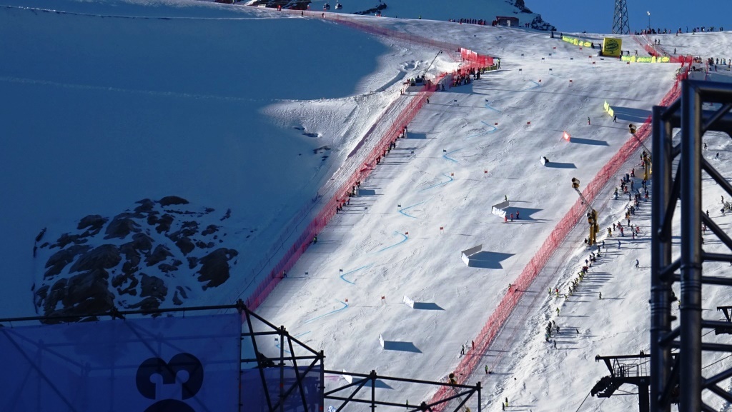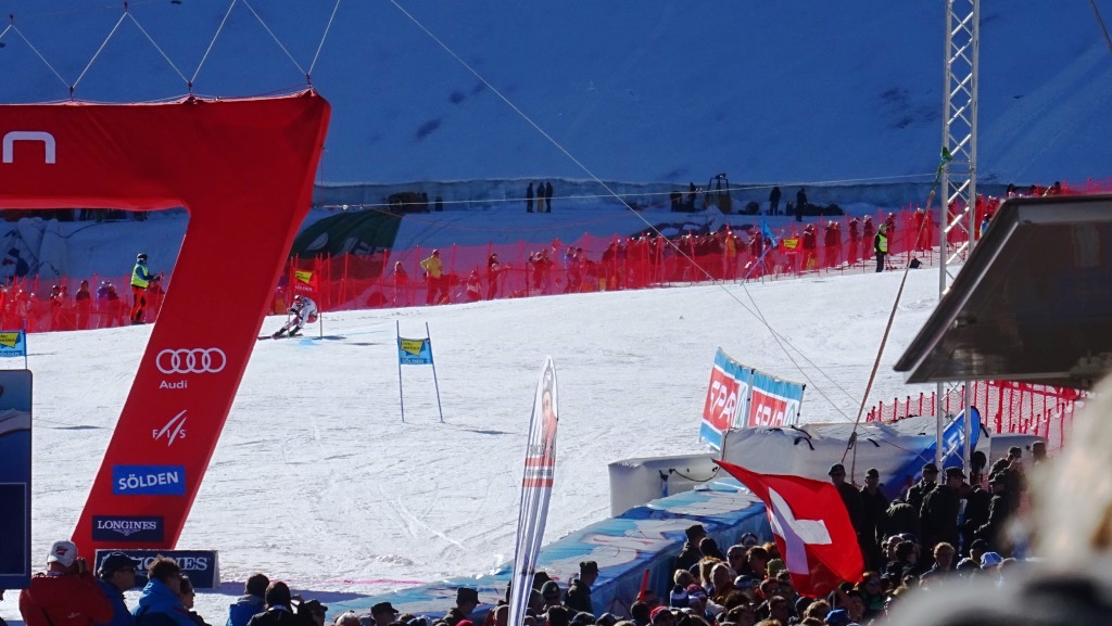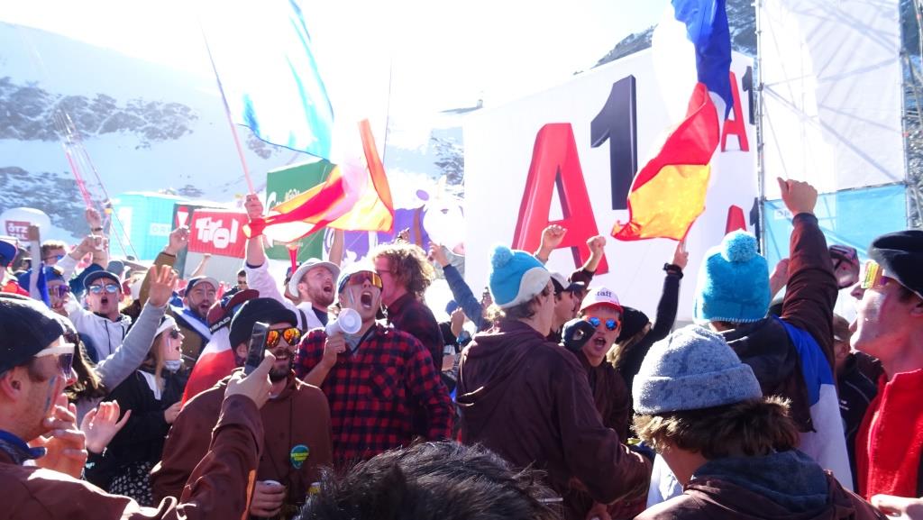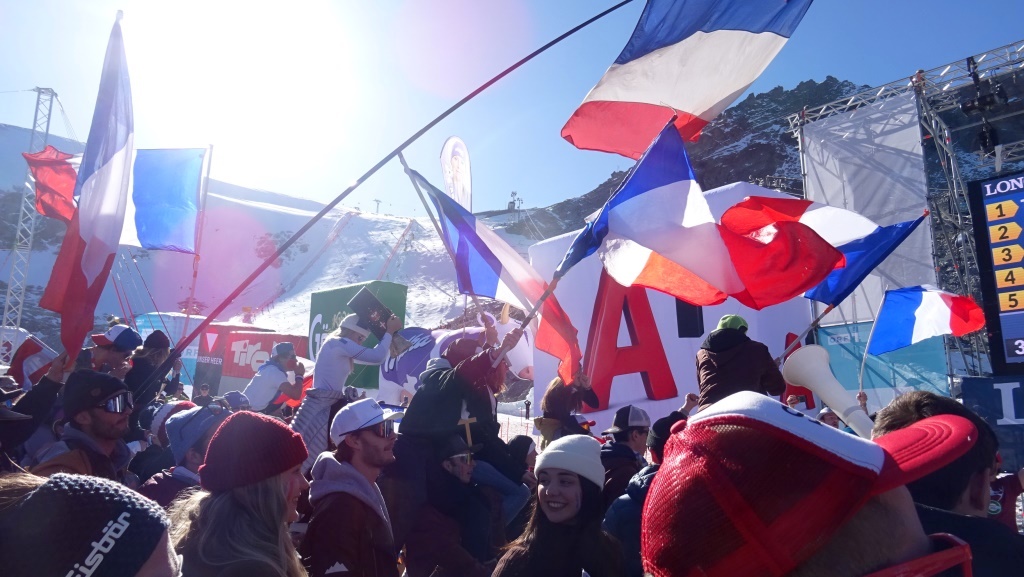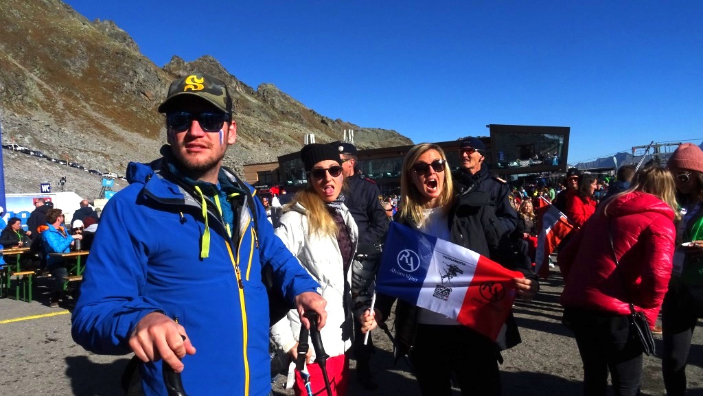 La montée au glacier du Rettenbach se fait en bus, sur une belle route de montagne que j’aimerais pas monter en vélo !Préparation « allez les bleus » 🙂La piste… et son mur : glacé, raide, long. Une des pistes les plus exigeantes en géant, pour commencer la saison…Team supporter de choc, Charlie, Lolo et MaguyDans la raquette !Entrée dans le mur, faut être « à l’heure » !Dès 11h du mat’ ça commence à s’exciter dans la raquette !Ambiance Cosy 🙂Les meilleurs supporters français réunis !Tessa Worley allume du vert sur la « deuse », et se classe finalement 3ème…Derrière Alice Robinson, 17 ans seulement, de New Zealand, et Mickaela ShiffrinTirage au sort des dossards pour le lendemain